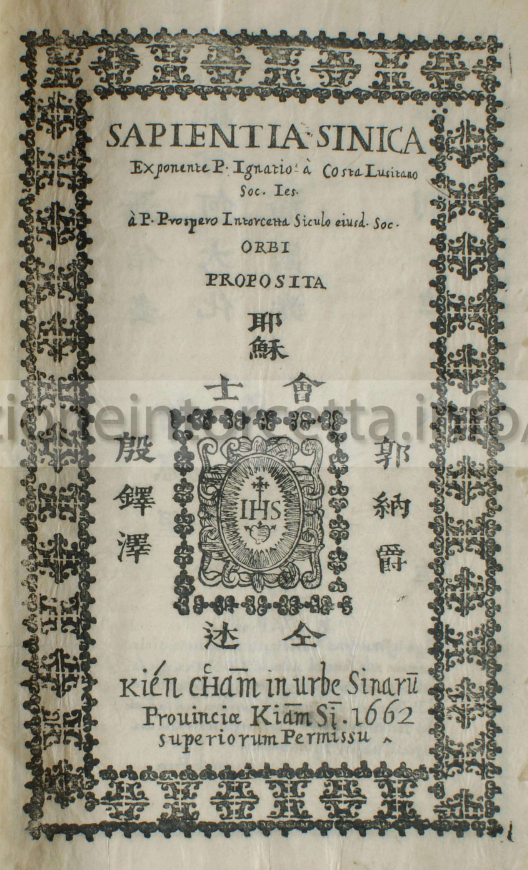Benedetti, Stefano, “Sapientia sinica (1662): sulla prima traduzione a stampa dei Dialoghi confuciani ad opera di Prospero Intorcetta", in Atti e memorie dell'Arcadia, 3, pp. 167-208, 2014.