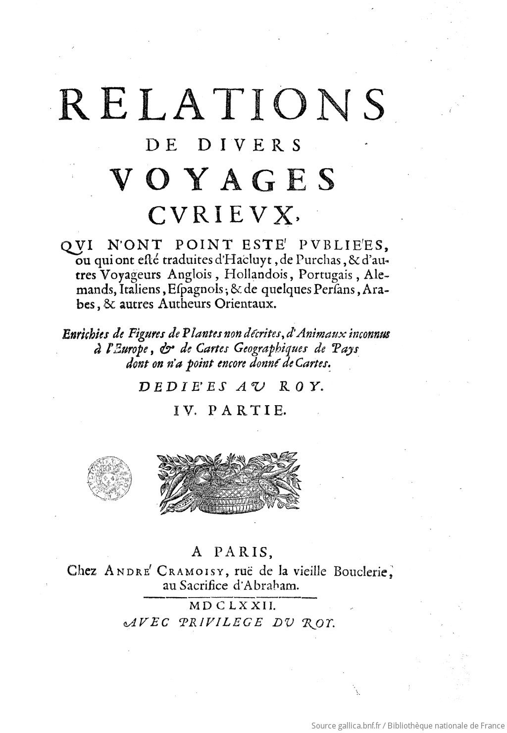 | Full Title | Relations de divers voyages curieux, quin’ontpointesté publiées, ou qui ont esté traduites d’Hacluyt, de Purchas, & d’autres Voyageurs Anglois, Hollandois, Portuguais, Allemands, Italiens, Espagnols, & de quelques Persans, Arabes, & autres Autheurs Orientaux |
