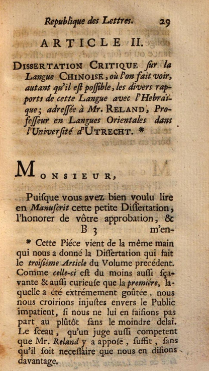 2.  Dissertation critique sur la Langue Chinoise, où l’on fait voir, autant qu’il est possible, les divers rapports de cette langue avec l’hébraique; adressé à Mr. Reland, Professeur en langues orientales dans l’Université d’Utrecht.